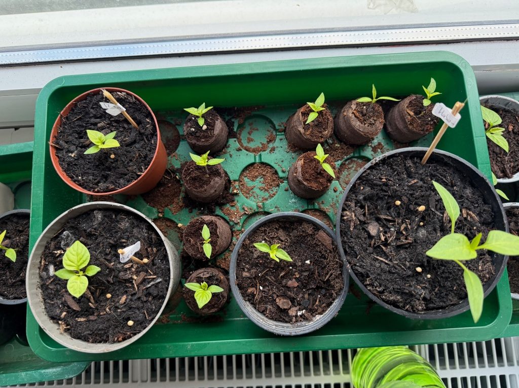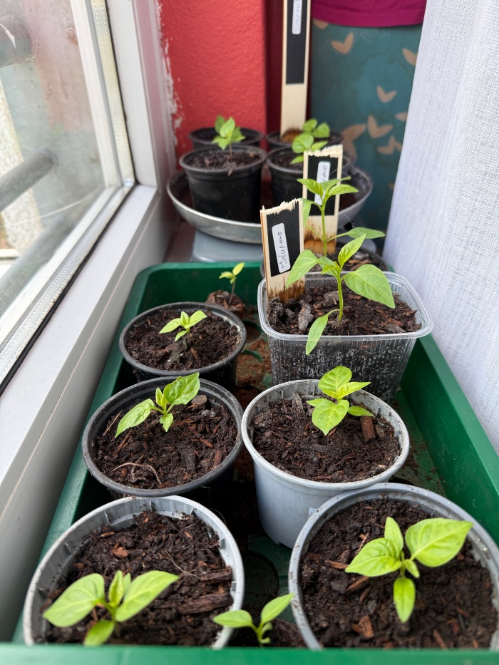 Chillies sind mimösliche und wärme- und lichtliebende Pflanzen, sie stammen aus subtropischen bis tropischen Gefilden und würden sich im dunkelkalten Norddeutschland freiwillig niemals ansiedeln (was auch aus humanoider Perspektive durchaus nachvollziehbar ist). Gerade die exotischeren Spezialsorten keimen ausgesprochen schlecht und langsam, es sei denn, man sorgt für ein wohliges Keimklima. Alle Samen wurden Ende Februar ca. 36 h in kaltem Kamillentee eingeweicht, was ihre Keimfähigkeit fördern und Pilzbefall o.ä. verhindern soll. Anschließend wurde jeweils ein Samen in eine Kokos-Quellscheibe eingesät und mit ca. 0,5 cm Anzuchterde bedeckt, die aufgequollenen Scheiben kamen anschließend in Zimmergewächshäusern unter. Damit die Keimtemperatur von ca. 28°C konstant gehalten werden konnte, standen die Gewächshäuschen auf einer Heizmatte. Nach anderthalb Wochen waren die ersten Sämlinge zu erkennen. Mit dem Erscheinen aller anderen Sämlinge konnte dann auch die Heizmatte entfernt werden, da nun geringere Temperaturen und mehr Licht wichtig waren. Zwei weitere Wochen später, mit dem Erscheinen der ersten Vegetationsblätter, erfolgte der Umzug in größere Töpfchen mit hochwertiger Tomaten- und Gemüseerde. Dort wurden sie auf der gesamten Länge ihres Stieles in der Erde versenkt, damit sich die sog. Adventivwurzeln aus dem Stiel entwickeln und die Pflanze zusätzlich mit Wasser und Nährstoffen versorgen können. Sobald sie ca. zehn Zentimeter groß sind, werden sich vorsichtig mit Chilliedünger versorgt.