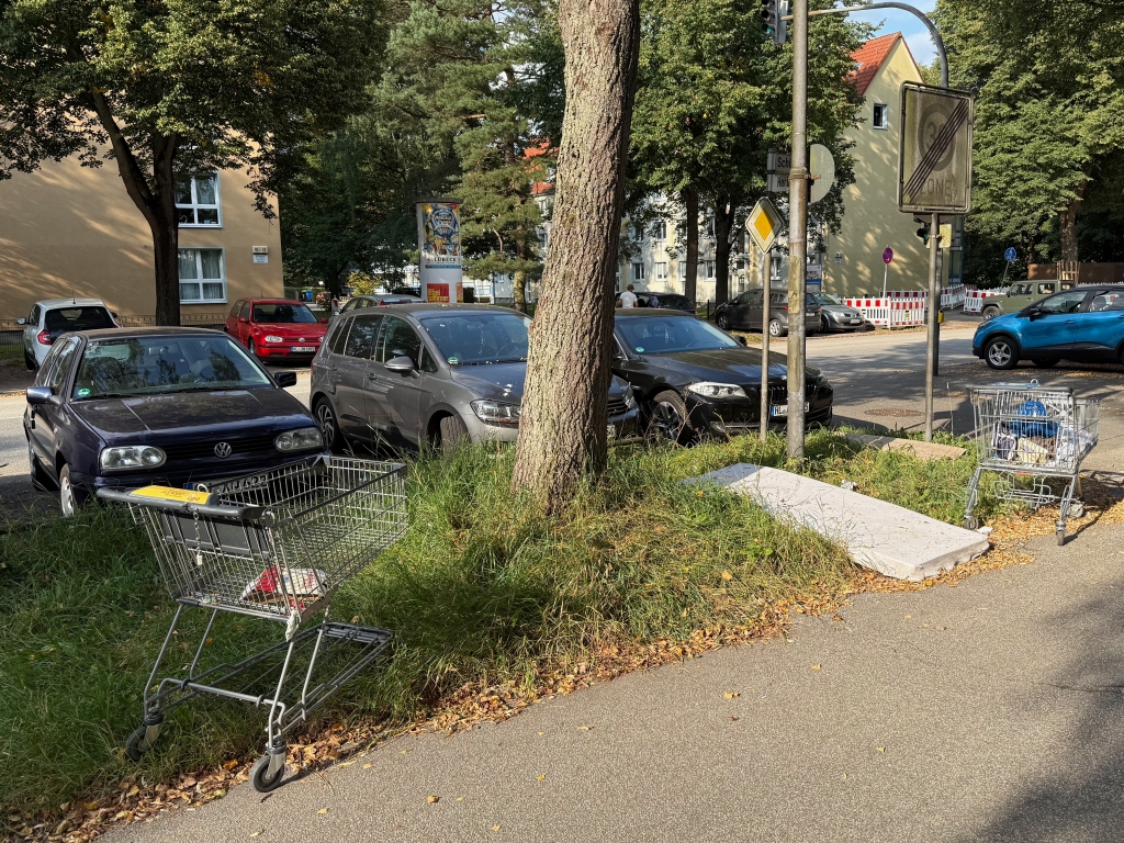 Ein Dutzend locker über den Kaufhof verteilte herrenlose Einkaufswagen, teils gefüllt mit verrottetem Abfall und versteinertem Kot. Auf dem Boden ein ganzkörpertätowierter Bettler, daneben ein Kerl, der einen anderen Kerl mit einem Messer bedroht, während ein dritter Kerl dem Opfer mit eingenässter Hose das Handy klaut. Titel: Marli, Miteinander und der Müll.